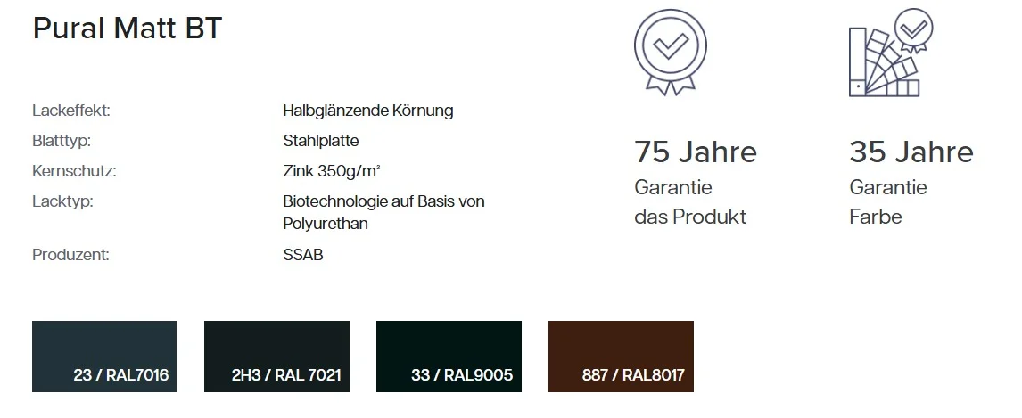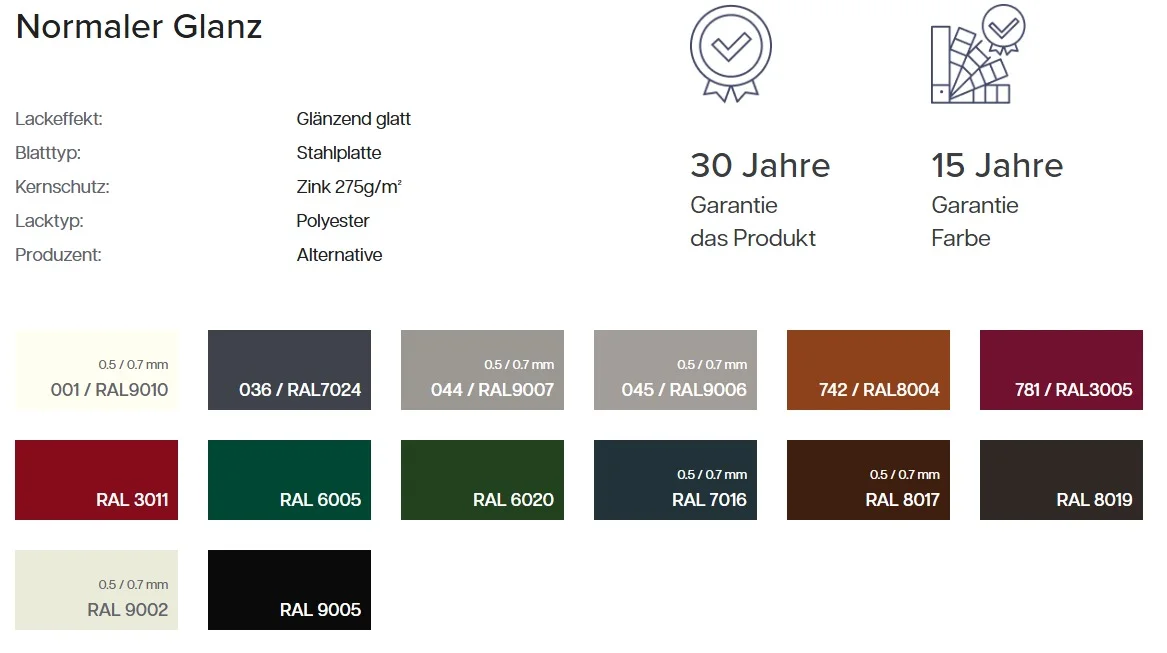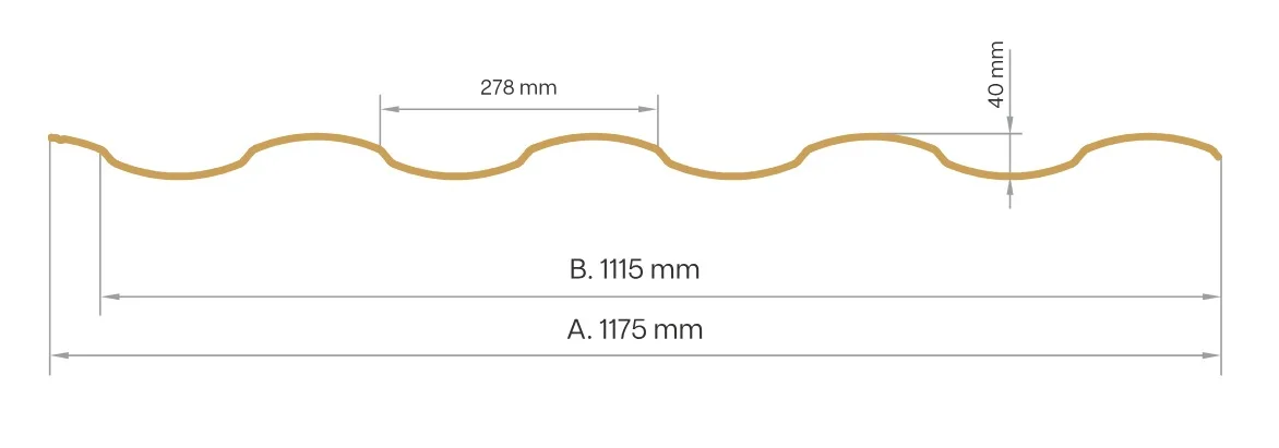 Qualität: 1 Wahl Stahlwerk: SSAB Modullänge: 350 mm Länge Max: 5500 mm Nutzbreite: 1115 mm Deckbreite: 1175 mm Beschichtung: Standardpolyester 25 µm Materialstärke: 0,50 mm Material: Verzinkte Stahl Profilhöhe: 40 mm Gewicht: 4.8 Kg/ m²