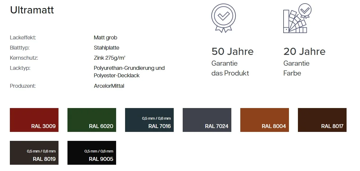 Centro ist eine perfekte Kombination aus dem Komfort modularer Metalldachziegel und der Ästhetik herkömmlicher Lösungen. Diese fortschrittlichste Form von Metalldachziegeln ist bequem zu transportieren, schnell zu installieren und langlebig im Betrieb. Die Hybrid-Blechdachpfanne ist in zwei Verkaufsmodellen erhältlich – als Maßanfertigung in beliebiger Länge und mit Fixlänge (Module)