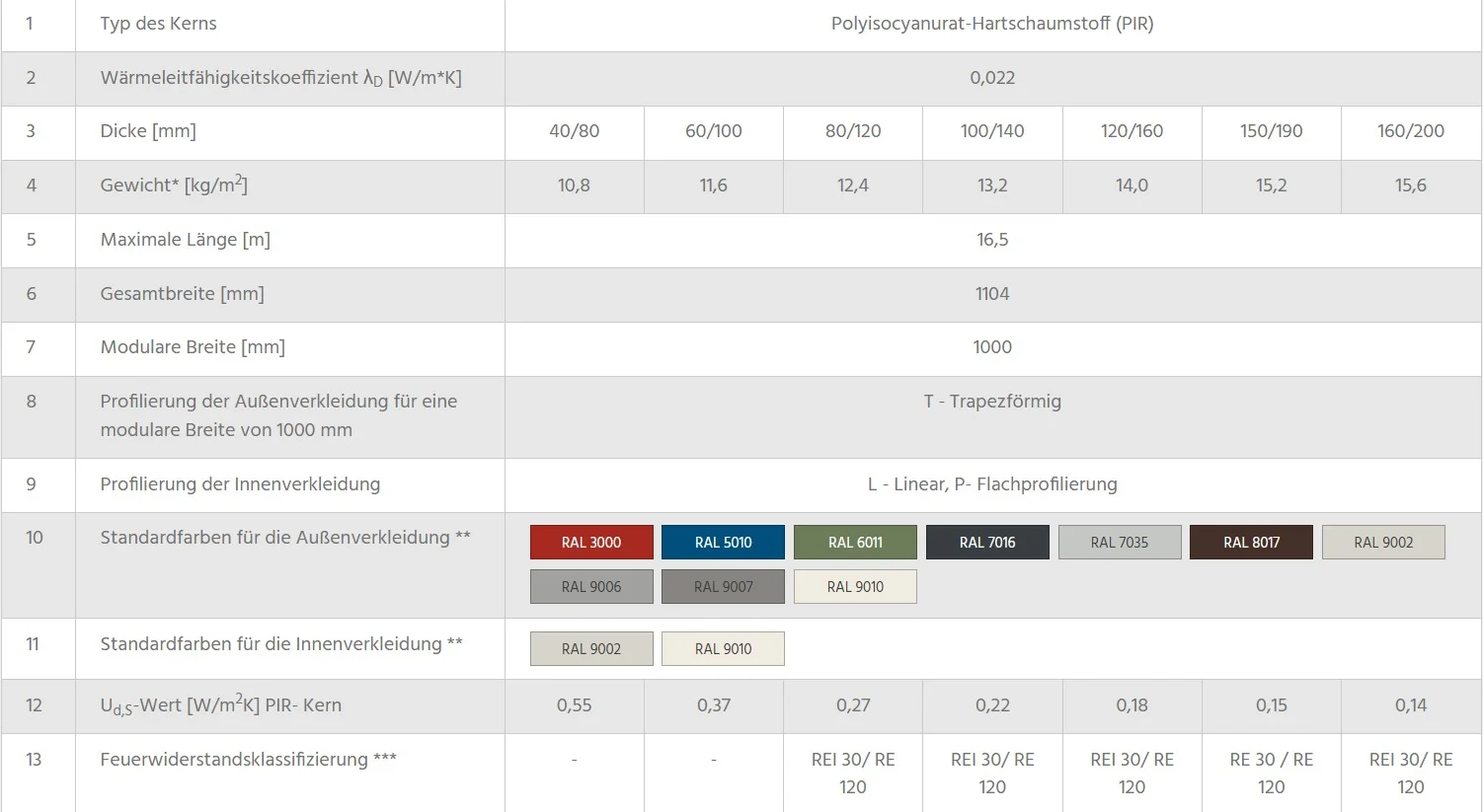 Qualität: 1 Wahl Verwendung: Dach Kern: Polyurethan-Hartschaum PIR Nutzbreite: 1000 mm Blechstärke: Außen 0,5 mm Blechstärke Innen: 0,4 mm Beschichtung: Standardpolyester 25µm Länge: Min: 2000 mm / Max: 18000 mm